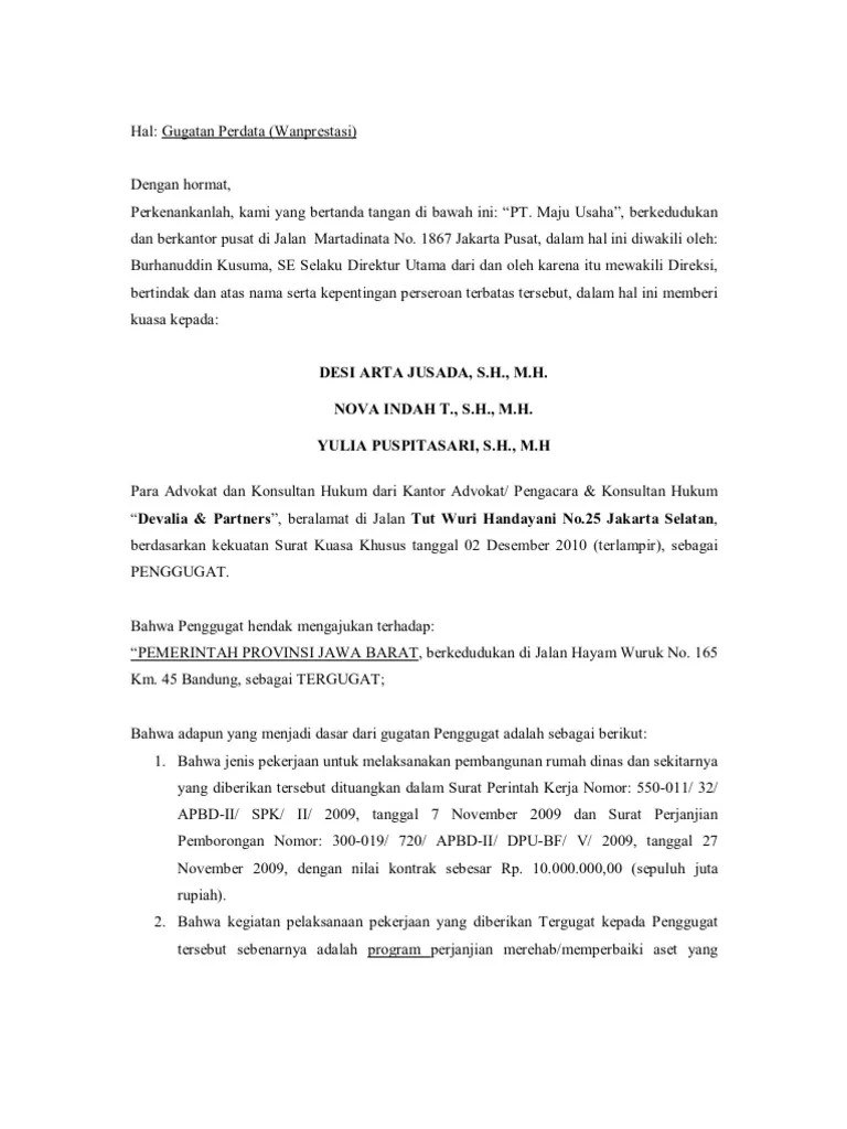 Advokat, berkantor di jalan bratayudha no 45, garut, berdasarkan surat kuasa tertanggal. Jun 26, 2019 · contoh surat gugatan ingkar janji picture submitted ang submitted by admin that preserved inside our collection. Oct 25, 2015 · lampiran : Bapak/ibu ketua pengadilan negeri palembang di kota palembang. File draf gugatan wanprestasi ini berisi draf gugatan atas wanprestasi perjanjian pemberian kerja, dimana pemberi kerja (tergugat) tidak melaksanakan kewajibannya membayar honorarium kepada pelaksana kerja (penggugat) yang telah melaksanakan kewajibannya melakukan …